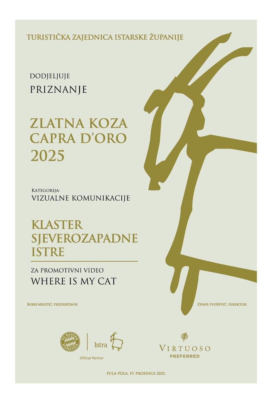 Der Tourismusverband der Gespanschaft Istrien verlieh dem Cluster Nordwestistrien die Auszeichnung Zlatna koza – Capra d’oro 2025 in der Kategorie Visuelle Kommunikation für das Promotionsvideo „Where is my cat“ .