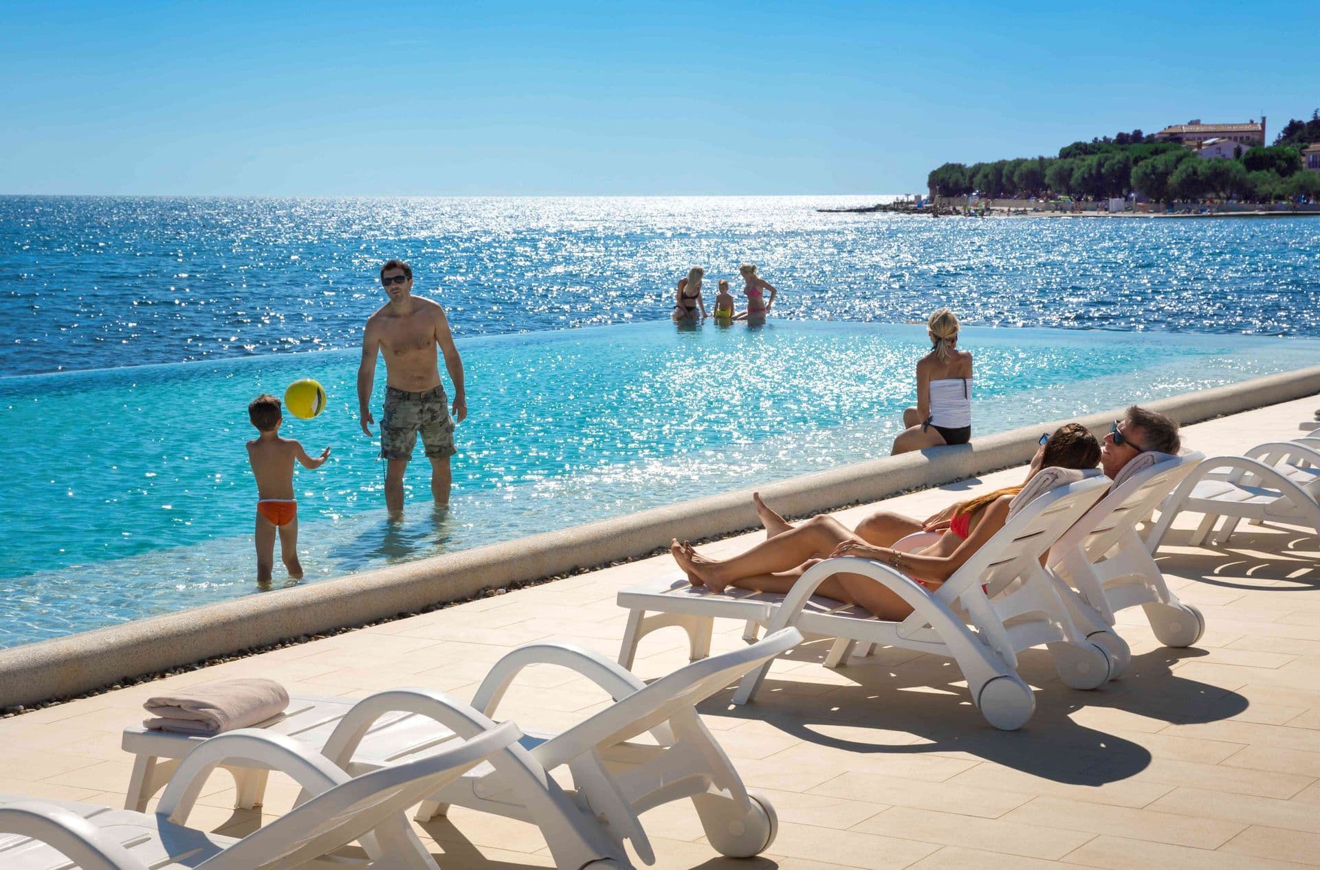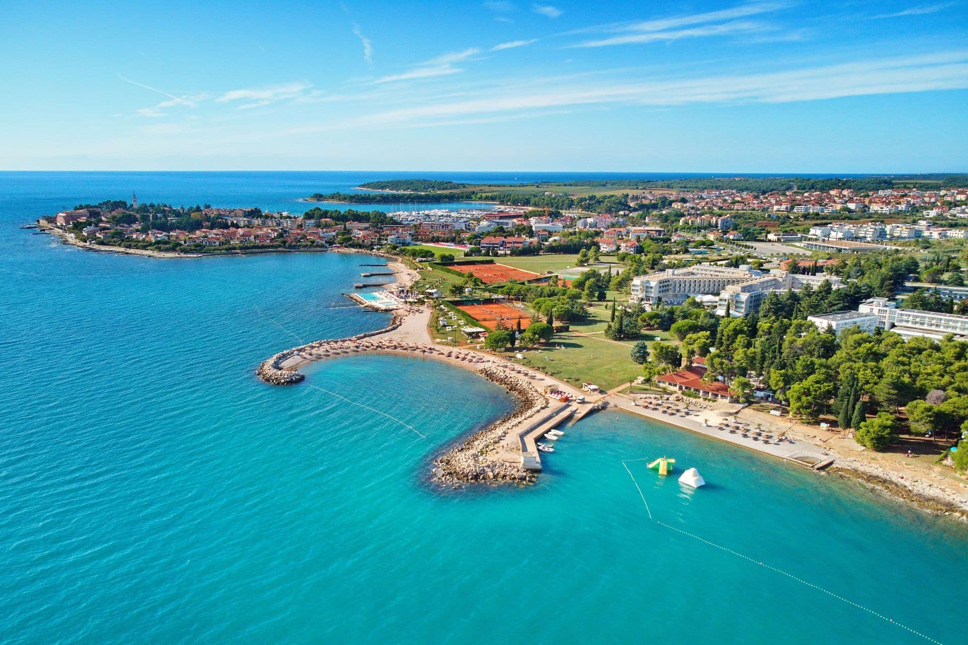 Unterhalb des Hotels Aminess Maestral erwartet Sie ein schöner sichelförmiger Kiesstrand. Er ist seit vielen Jahren mit einer Blauen Flagge ausgezeichnet, was zusätzliche Sauberkeit und Ordnung garantiert. Dieser attraktive Strand ist mit Liegestühlen und Sonnenschirmen ausgestattet, und bietet im Sommer die Möglichkeit von Massagen im Freien. Dank des nahgelegenen Unterhaltungszentrums Punto Mare mit seinem Gezeitenbad, dem täglichen Unterhaltungsprogramm sowie dem Angebot an Sandwiches, Cocktails und verschiedenen Snacks, zählt dieser Strand zu den unterhaltsamsten in Novigrad. Für alle Sportliebhaber gibt es gleich am Meer 17 Tennisplätze, ein Beachvolleyballplatz, ein Mehrzweckspielfeld für Fußball, Basketball und Handball. Sollten Sie Wassersport bevorzugen, dann gibt es die Möglichkeit Kajaks, Jetskis oder Tretboote zu mieten. Wir erinnern daran, dass der Zugang zum Meer Menschen mit Behinderungen angepasst ist.