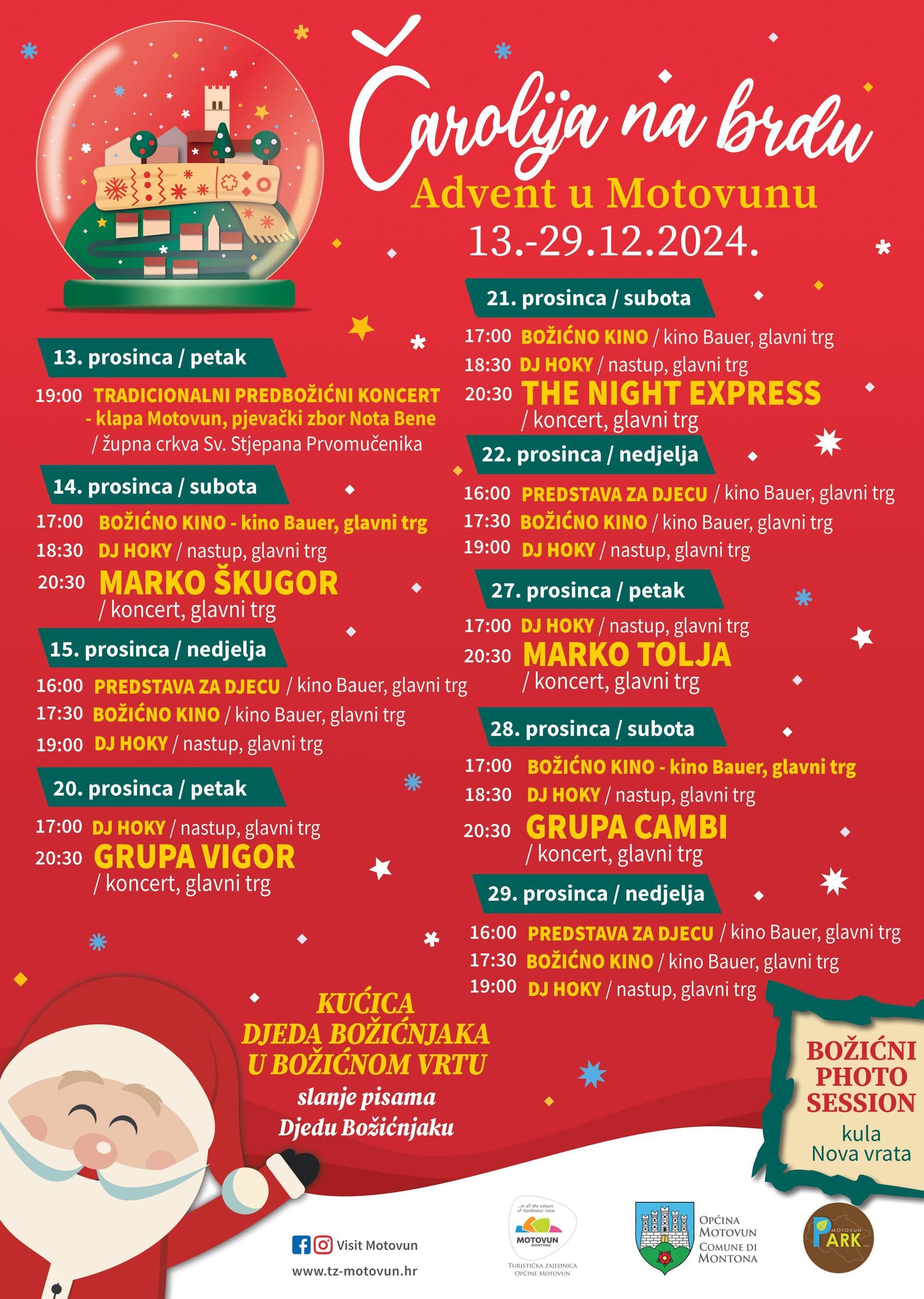 Na glavnom motovunskom trgu vas očekuje prigodna i bogata gourmet ponuda u adventskim kućicama, kao i bogati zabavni program sa sjajnim glazbenim izvođačima poput Marka Škugora, Grupe Vigor, Night Express-a, Marka Tolje i Grupe Cambi! Ulaz na sva događanja je slobodan, a parking za sve posjetitelje besplatan od 15 sati.