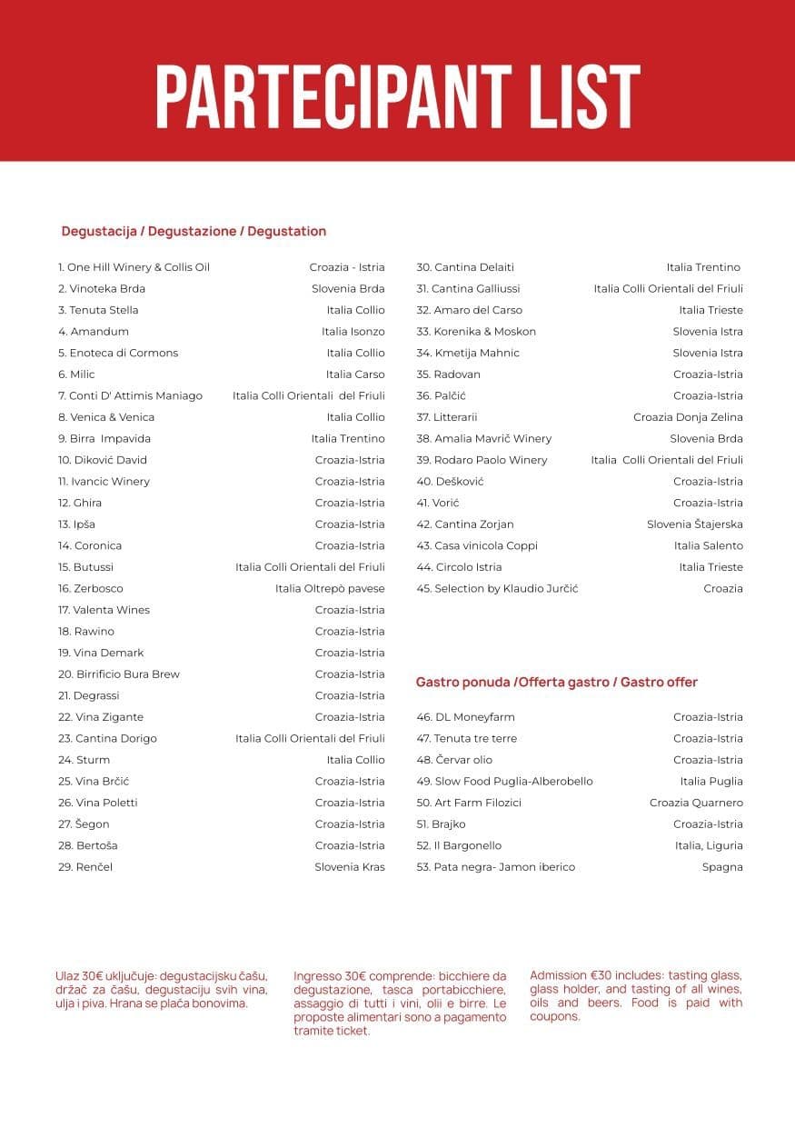 Svoju će ponudu u ugodnom ambijentu atrija novigradske Zajednice Talijana, u samom srcu povijesne jezgre Novigrada, predstaviti oko 50 proizvođača pa će to biti prilika za kušanje cijele palete vrhunskih proizvoda iz raznih zemalja.