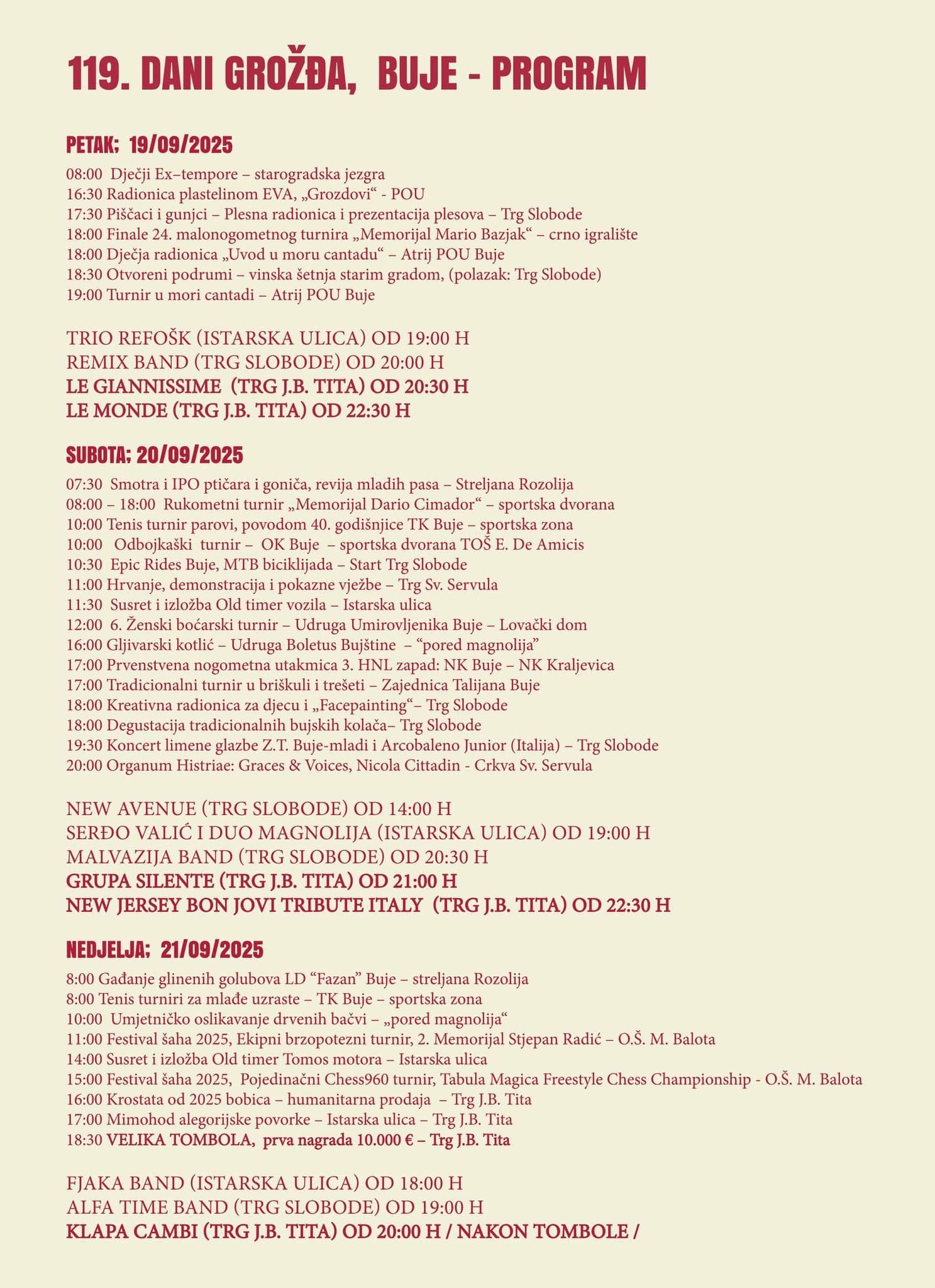 U nedjelju 21.rujna se atmosfera zaokružuje uz radionice, izložbe i završni koncert Klape Cambi, dok se svi s nestrpljenjem okupljaju na velikoj tomboli s nagradnim fondom od 13.800 €, uključujući glavnu nagradu od čak 10.000 €.