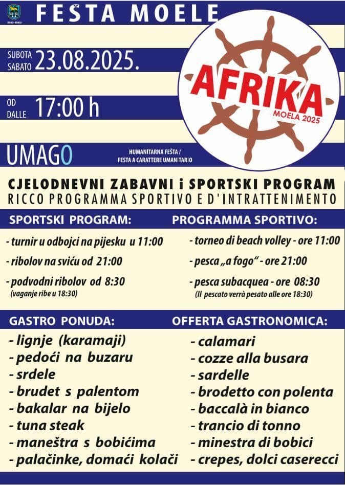U subotu, 23. kolovoza 2025., plaža „Afrika“ ponovno postaje mjesto zajedništva, solidarnosti i dobre zabave. Fešta Moele u svom dvanaestom izdanju okuplja volontere, posjetitelje i donatore s istim ciljem – pomoći onima kojima je najpotrebnije.