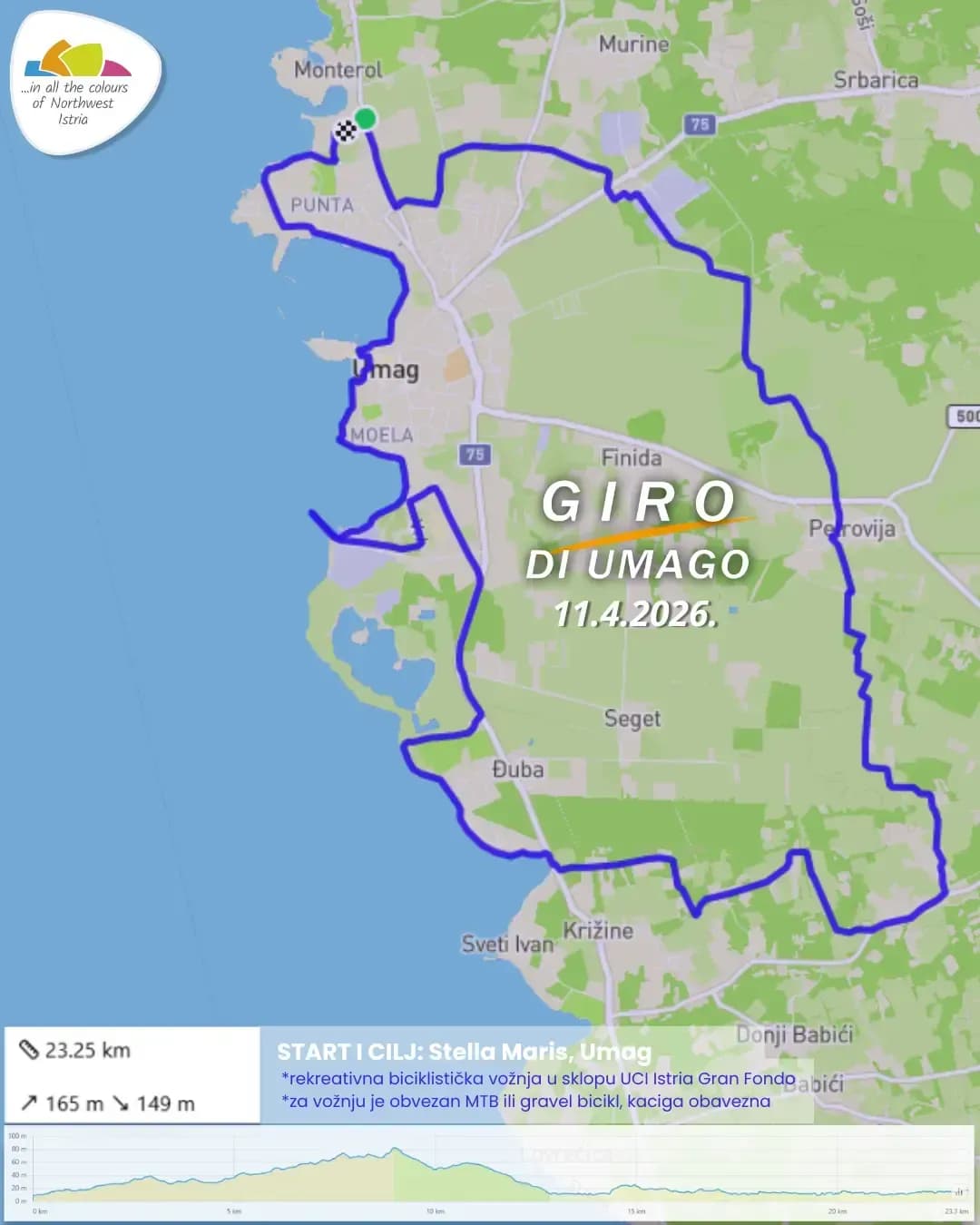 Premijerno izdanje Giro di Umago donosi opuštenu vožnju po mirnim predjelima oko Umaga, daleko od gradske gužve i automobila. Vožnja je idealna za obitelji, ali i sve koji žele zajedno uživati u biciklizmu bez natjecateljskog pritiska, kao dio iskustva UCI Istria Gran Fondo.