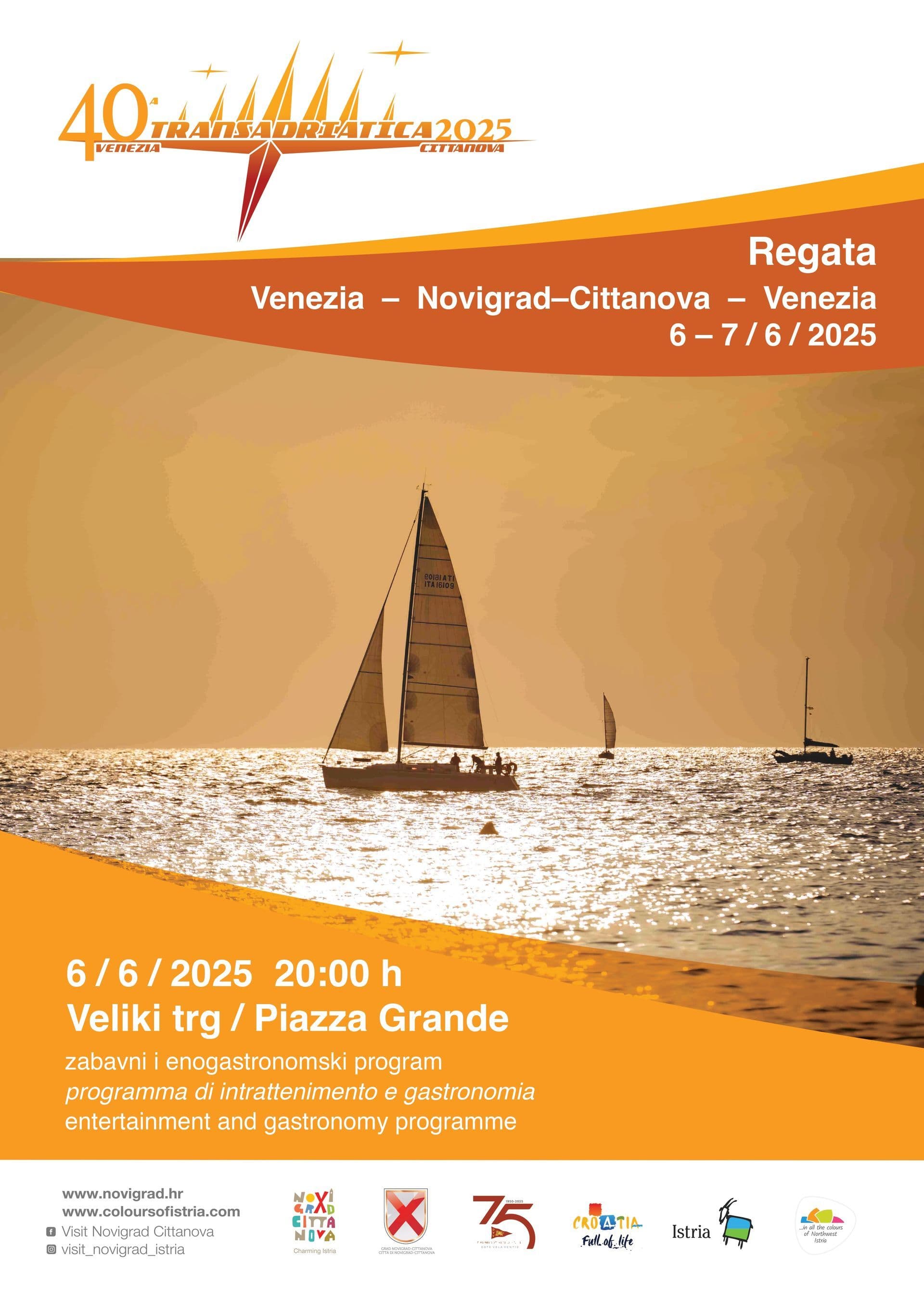 Tradicionalna venecijanska regata Transadriatica, koja desetljećima spaja dvije obale Jadrana, uplovit će u novigradsku luku 40. put, a tim povodom 6. lipnja na Velikom trgu će se održati zabavni program s enogastronomskom ponudom.