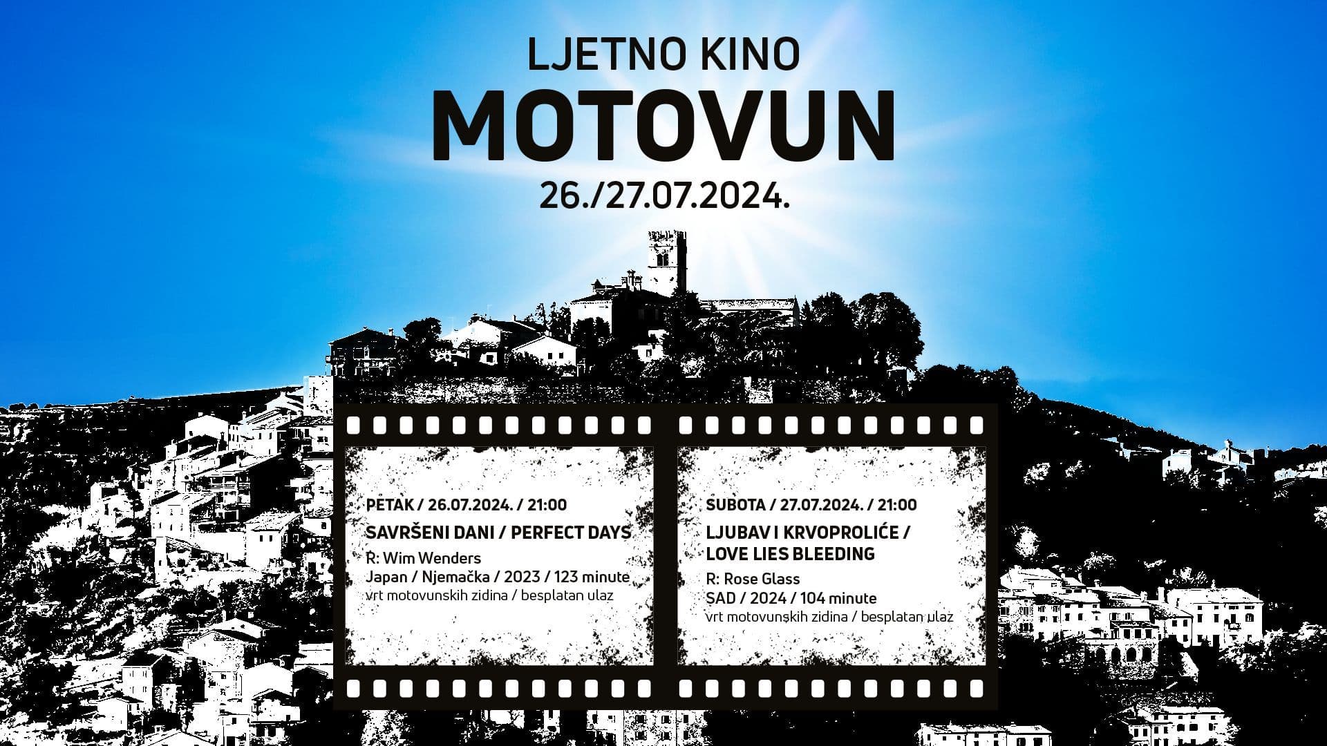 Motovun vas i ove godine poziva na uživanje u gledanju filmova na otvorenom, ispod zvjezdanog neba. U petak 26. i subotu 27. srpnja će se s početkom u 21 sat u prekrasnom ambijentu vrta motovunskih zidina, na samom vrhu pitoresknog Motovuna, održati dvije besplatne projekcije sjajnih filmskih ostvarenja! U petak 26.7. nas očekuje film „Savršeni dani”, remek djelo velikog Wima Wendersa, a u subotu 27.7. je na rasporedu film „Ljubav i krvoproliće”, nabrijana akcijska avantura talentirane redateljice Rose Glass.