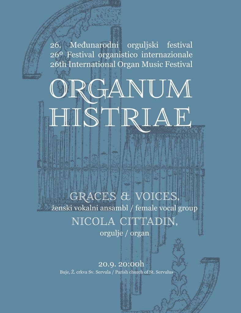 26. međunarodni festival Organum Histriae donosi svoj najposebniji program u Buje 20. rujna. U župnoj crkvi sv. Servula nastupit će austrijski vokalni ansambl Graces & Voices uz pratnju talijanskog orguljaša Nicole Cittadina. Publiku očekuje nezaboravna večer u kojoj će spoj vrhunskih glasova i autentičnog zvuka povijesnih orgulja doći do punog izražaja. Kao i na sva događanja, ulaz je slobodan.