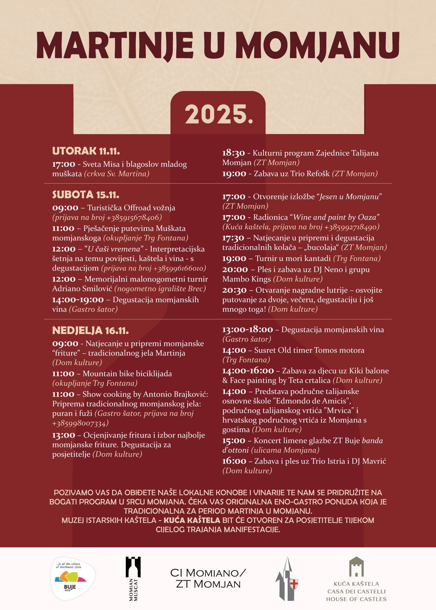 Svakog studenog, u vrijeme kada se rađaju slatki sokovi mladog vina, Momjan slavi svog zaštitnika sv. Martina. Tog katoličkog sveca europska tradicija drži zaštitnikom vinara i vinogradara te se na njegov dan u mnogim zemljama i krajevima krsti mlado vino. Iznimka tome nije ni Momjan, mali povijesni gradić sjeverno od Buja, vrlo dobro poznat među regionalnim poznavateljima vina i loze. Smješten nedaleko od granice sa Slovenijom, Momjan je oaza slatkog muškata, proisteklog iz višestoljetne sinteze idealnog tla i klime. Doda li se tome da gradić i okolica kriju neka od najjačih imena suvremenog vinarstva u Hrvatskoj, koja su se odavno proslavila i svojim malvazijama i teranima, postaju jasni pravi razmjeri i važnost ove manifestacije.