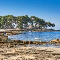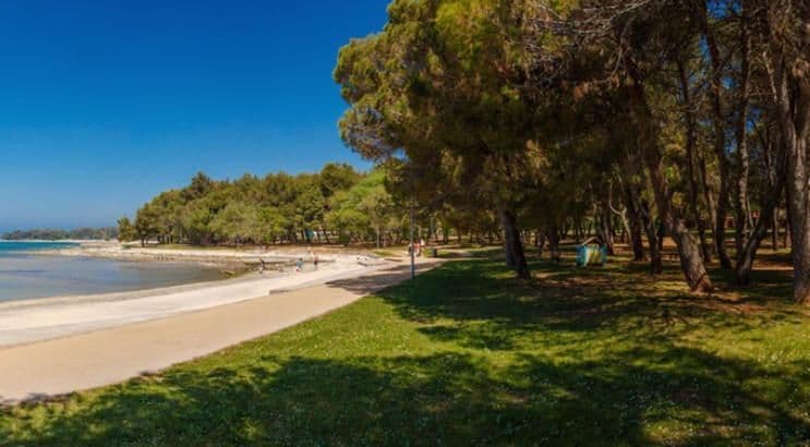 One of the best beaches for families with children is located at Punta Resort. This sandy beach is 1.5km from the centre of Umag. The shallow sea and easy water access make it great for children and non-swimmers. If possible, visit in the morning when the sea is clear and clean and there are fewer people on the beach. You can find respite from the sun in the shade of pine trees near the beach. Near the beach, you will find a playground with slides and swings, a beach volleyball court, a restaurant, and various stands with souvenirs, beach equipment, baked goods, etc.