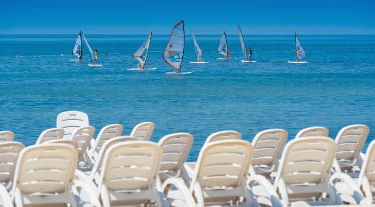 Polynesia beach is located at Katoro Resort near Umag. It is divided into pebble, paved, and rocky parts. Various sports amenities are located on and near the beach, such as beach volleyball, the Umag Tennis Academy, a playground for kids and a water sports centre. A swimming pool for adults and a swimming pool for children and babies are located next to the beach. You can reach the beach by tourist train.