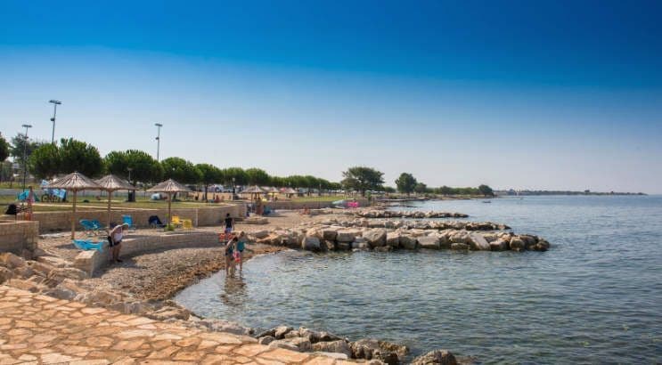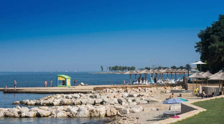 Canova beach is located at Camping Park Umag, 9km from the centre of Umag. This is a rocky beach with paved sections, and entry to the water is via easy steps and ramps, making sea access easy for people with disabilities. Sun worshipers will love this beach, as there is no shade. It is equipped with sun loungers, parasols, and canopies. The beach features a children's playground and a sandpit, both shaded by an awning. Next to the beach is a swimming pool complex with attractive sprinklers and slides for the little ones. Shops, bars and restaurants are located near the beach within the campsite. The beach has been a Blue Flag recipient for many years.
