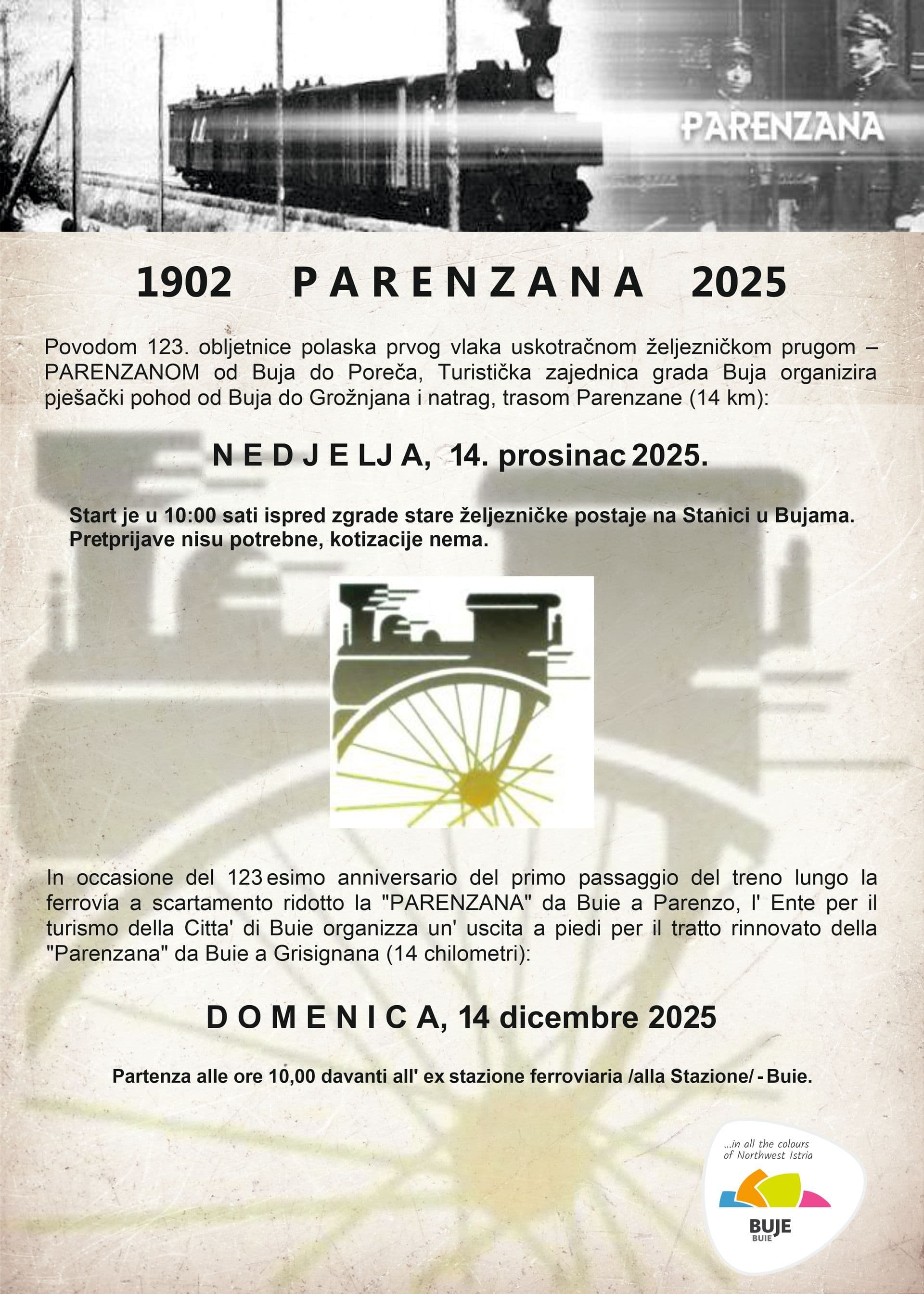 As part of the celebration of 123 years of the Parenzana railway, the Buje Tourist Board invites you to join a hiking tour from Buje to Grožnjan and back, along the 14 km trail of the legendary narrow-gauge line.