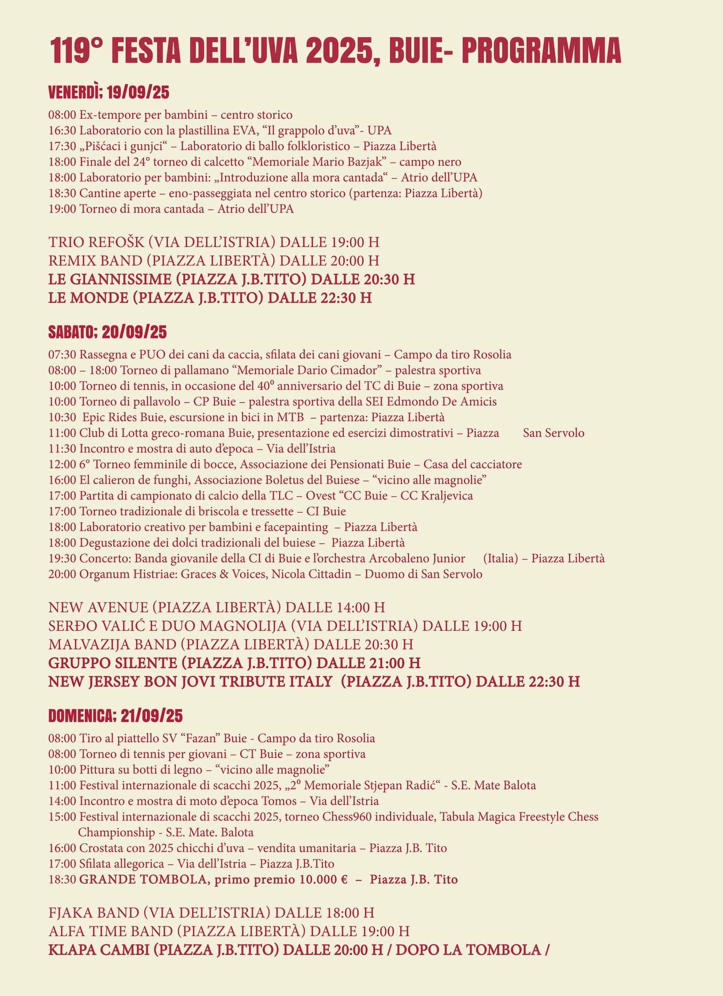 Domenica 21 settembre l’atmosfera si completa con laboratori, mostre e il concerto finale della Klapa Cambi, mentre tutti si riuniscono con entusiasmo per la grande tombola con un montepremi di 13.800 €, inclusa una vincita principale di ben 10.000 €.