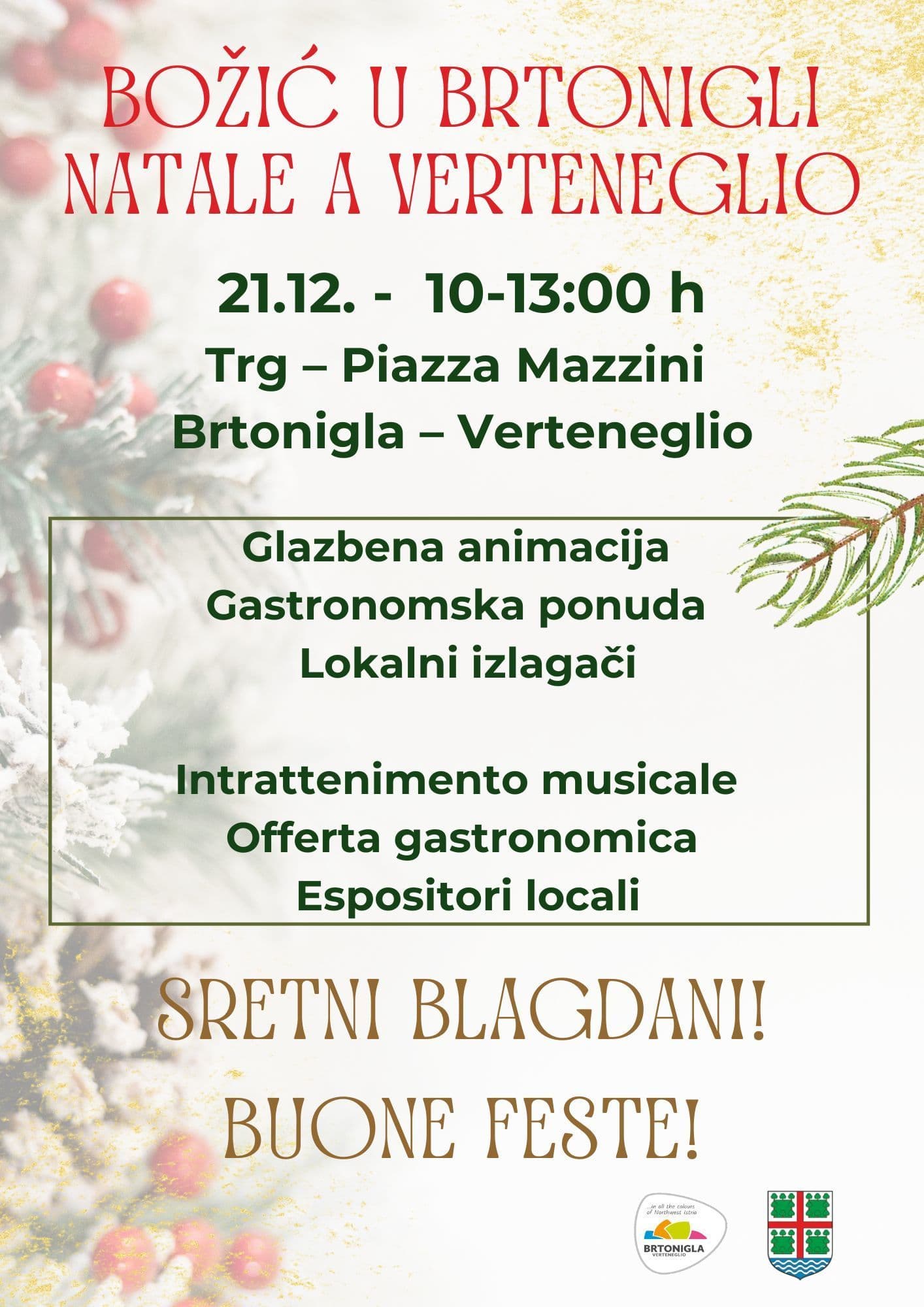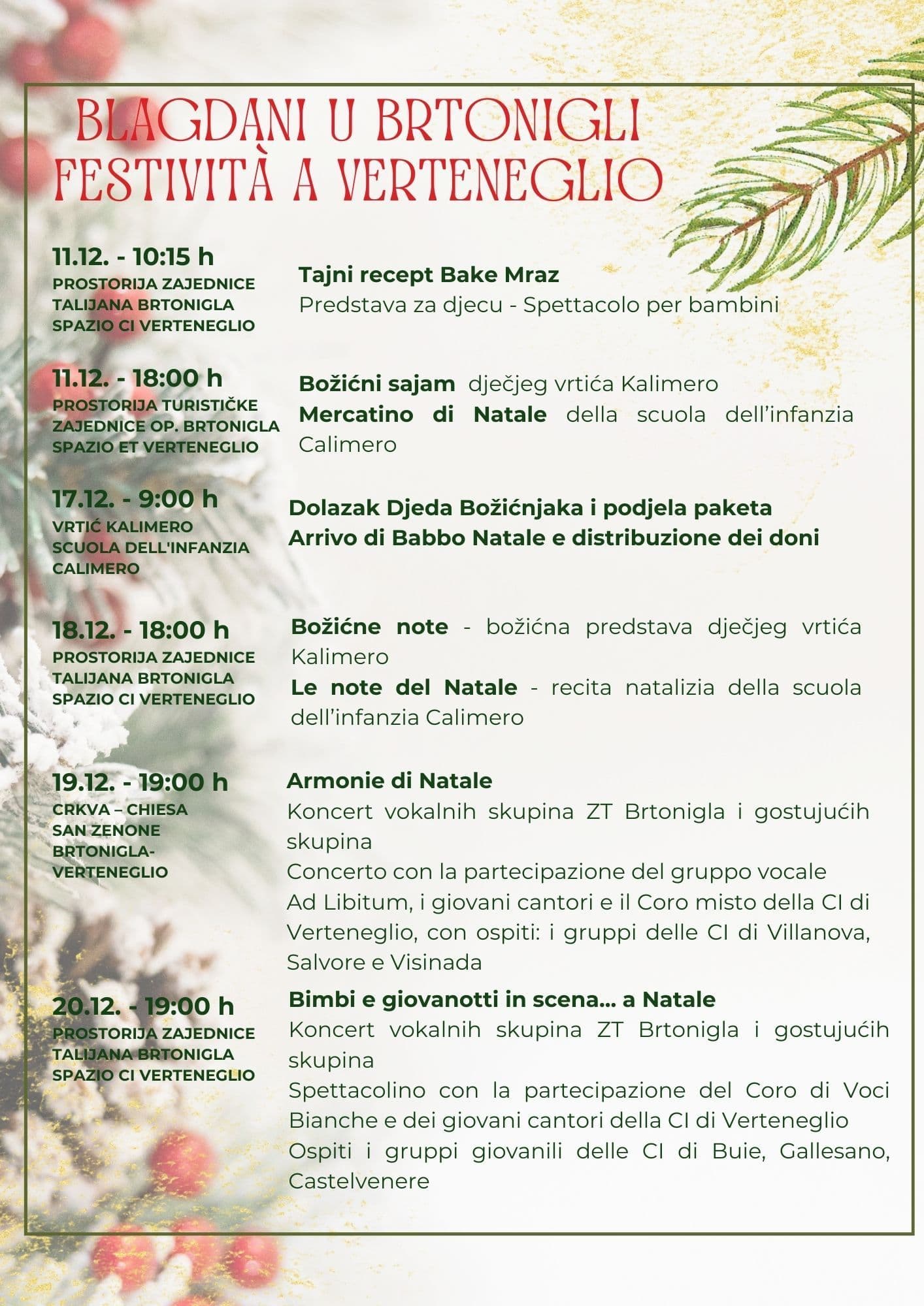 Ricco il calendario di eventi che va ad abbracciare tutto il periodo natalizio, progetti ideati e organizzati dagli enti e comunità locali quali la Comunità degli italiani di Verteneglio, la Comunità degli italiani di Villanova, l'Ente turistico, il Comune di Brtonigla- Verteneglio e la scuola dell'infanzia Calimero.