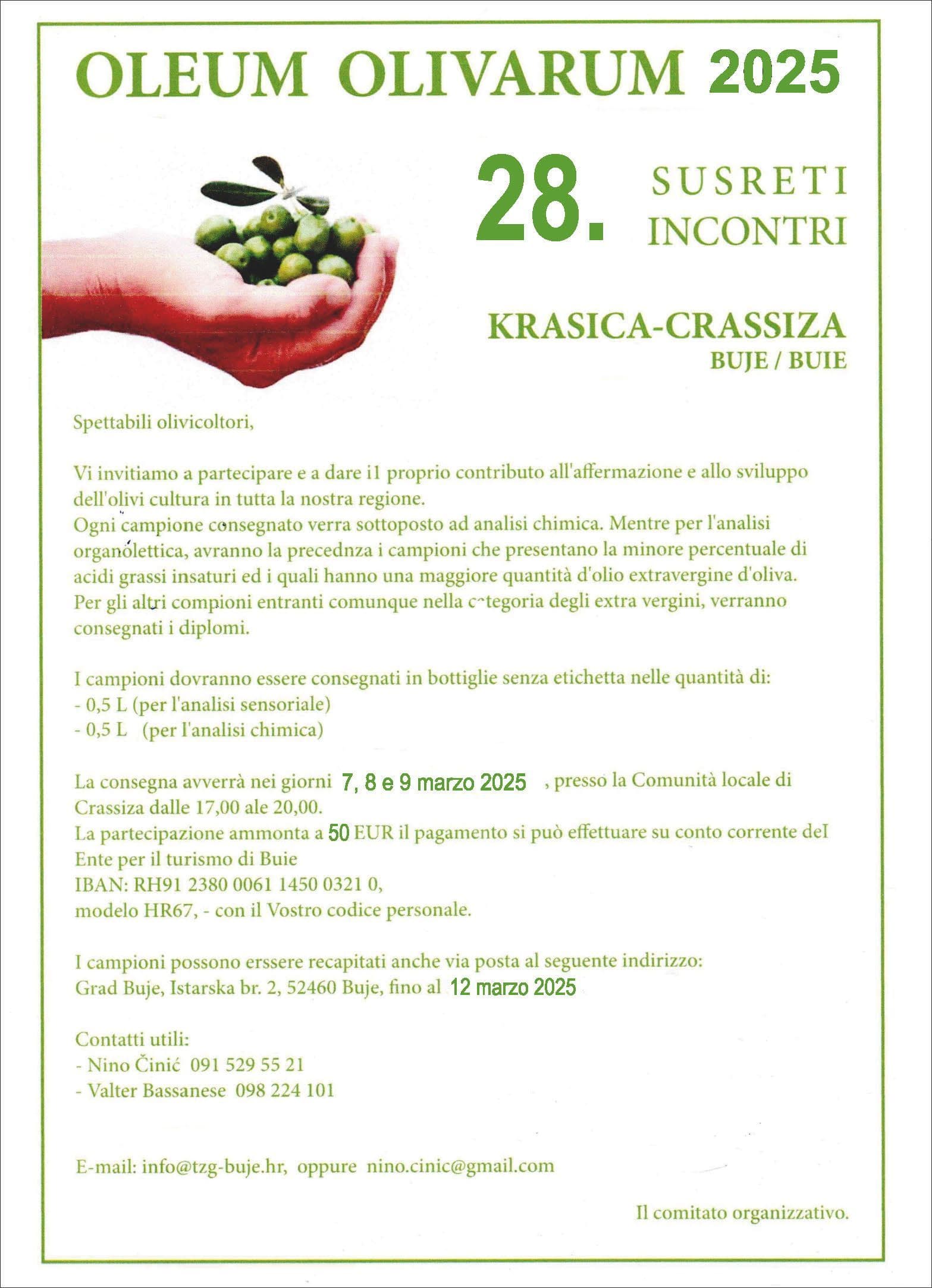 Il pittoresco paesino di Crasizza, nei pressi di Buie, accoglierà la 28. edizione di “Oleum olivarum”, una delle più antiche fiere in Croazia dedicate all’olio d’oliva. A questa manifestazione, che con il passare degli anni ha acquisito un carattere sempre più internazionale, prendono parte istituti scientifici e di ricerca, associazioni di coltivatori di olive e produttori di olio d'oliva provenienti dalla Croazia, dall'Italia e dalla Slovenia.