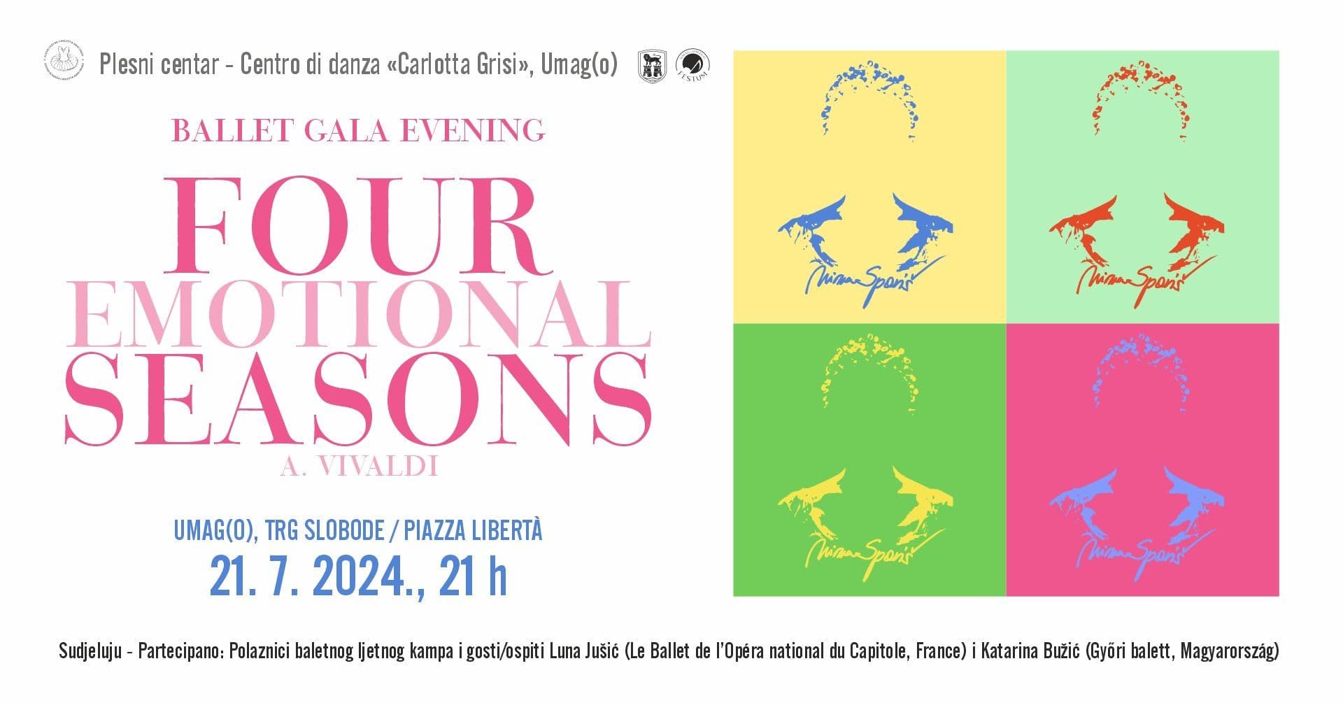 La Città di Umago, in collaborazione con l’Ente Festum e il Centro di danza Carlotta Grisi mettono in scena uno spettacolo di ballo del tutto unico: „FOUR emotional SEASONS“ di A. Vivaldi, in programma alle ore 21:00 di domenica 21 luglio 2024 in Piazza Libertà.