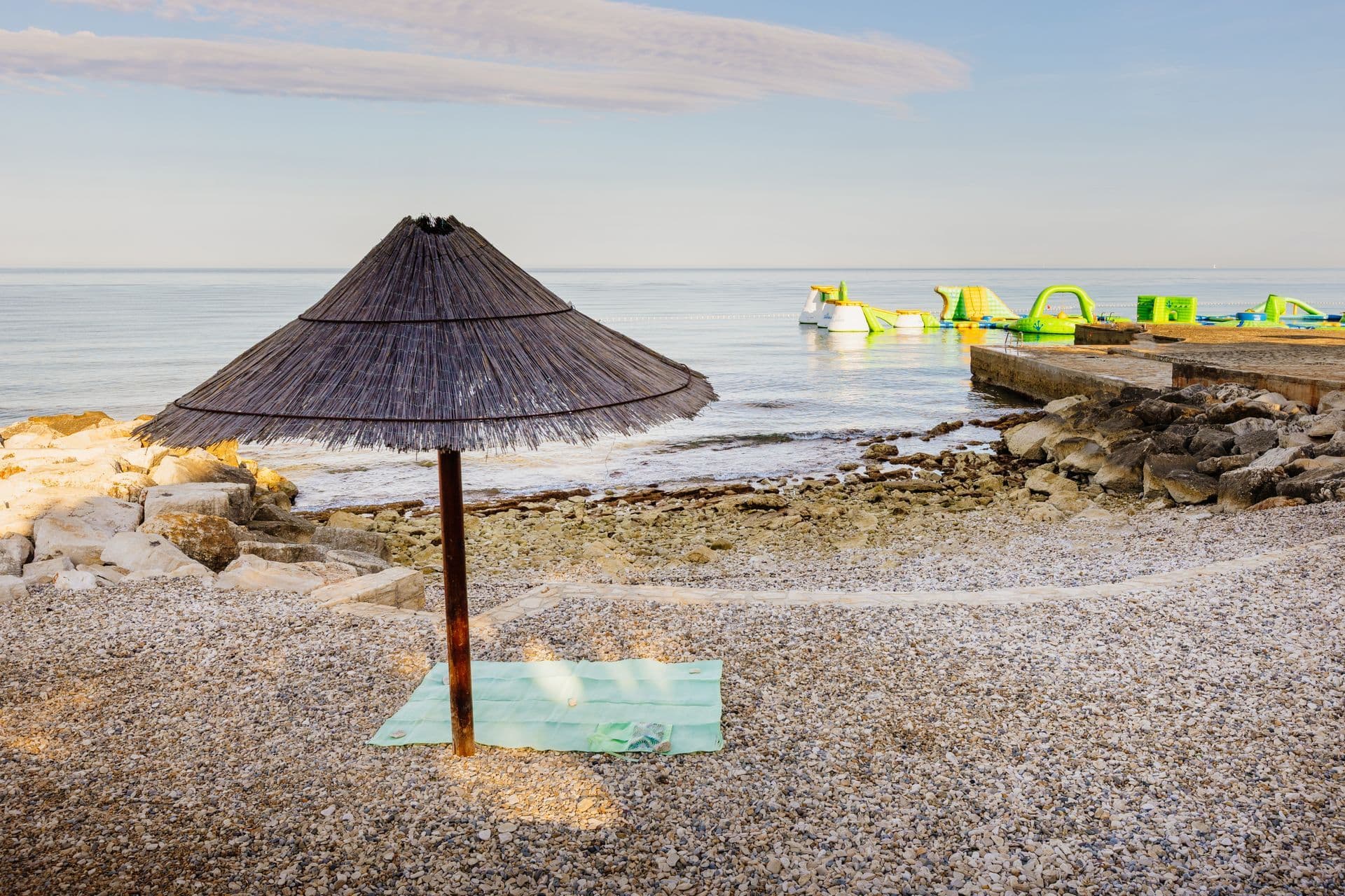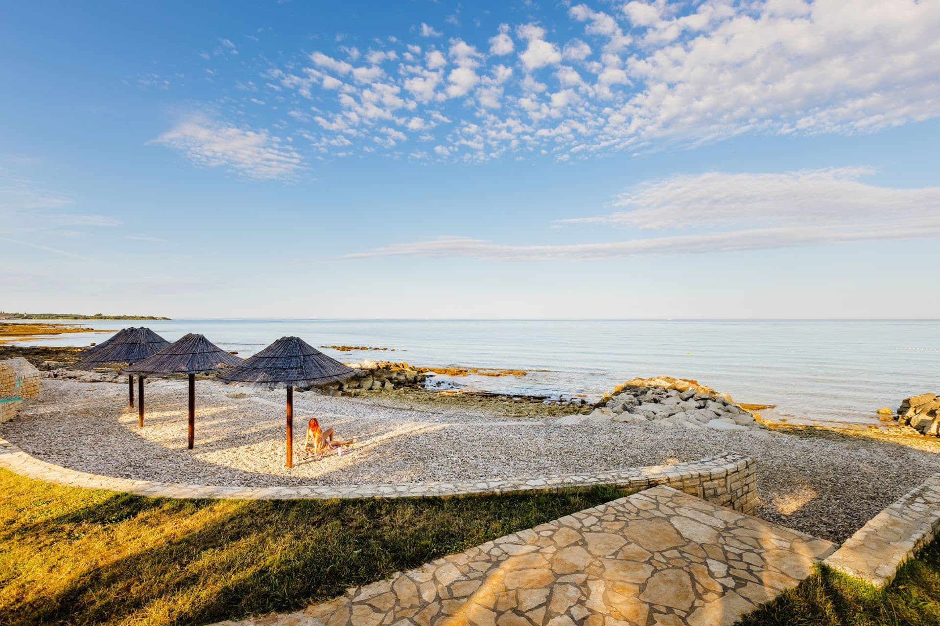 Šljunčana plaža u kampu Camping Park Umag nalazi se 9 km od centra grada Umaga. Plaža ima betonirani dio, uvalice s krupnijim šljunkom i stjenovite dijelove. Na raspolaganju su besplatni suncobrani, a ležaljke se iznajmljuju. Do plaže je travnata površina s borovima. U blizini su kafići, restorani i sportski centar za ljubitelje aktivnog odmora.