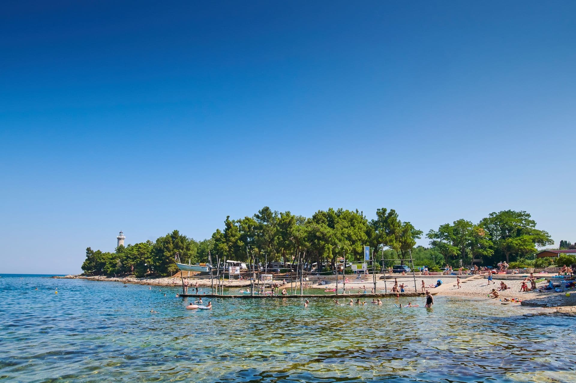 Plaža Savudrija smještena je u istoimenom naselju, kraj kampa Camping Savudrija, 8 km od Umaga. Šljunčana plaža s kamenitim dijelovima prikladna je za obitelji s djecom i starije osobe. Za osobe s invaliditetom na nekim je dijelovima plaže osiguran pristupačan ulaz u more. Borova šuma uz plažu pruža zaklon od jakog ljetnog sunca. Posebnu čar ovoj plaži daju karakteristične dizalice za barke gruei 36 metara visok savudrijski svjetionik.
