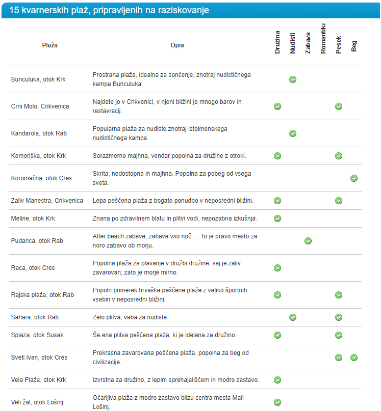 Pri nas velja pravilo, da kamor koli se boste napotili, boste naleteli na otok, kar še posebej velja za Kvarner. Na Rabu, Krku, Cresu in Lošinju je vrsta plaž za počitek, ki se jim ne morete upreti. Dodajte temu še plaže na kopnem, kot so v Crikvenici, in izbor je resnično velik.