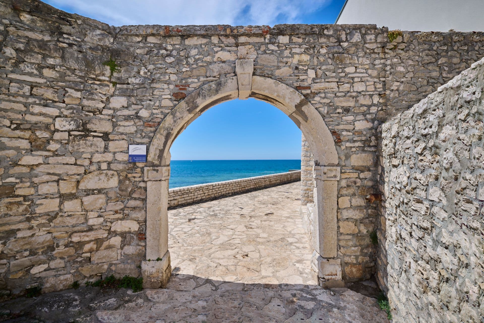 Deli obzidja in ostanki obrambnih stolpov so vidni z ulice Mandrač, na Porporeli in na cesti Prolaz Venecija, zato lahko svoje raziskovanje začnete prav tam. Ustavite se na privlačnem kamnitem pomolu ob obzidju, kjer boste zagotovo naleteli na goste, ki se sončijo, berejo ali lovijo ribe. To je sperone oziroma ostanek zidu v morju, zgrajen v 14. stoletju, katerega namen je bil preprečiti vdor osvajalcev po morski plitvini.