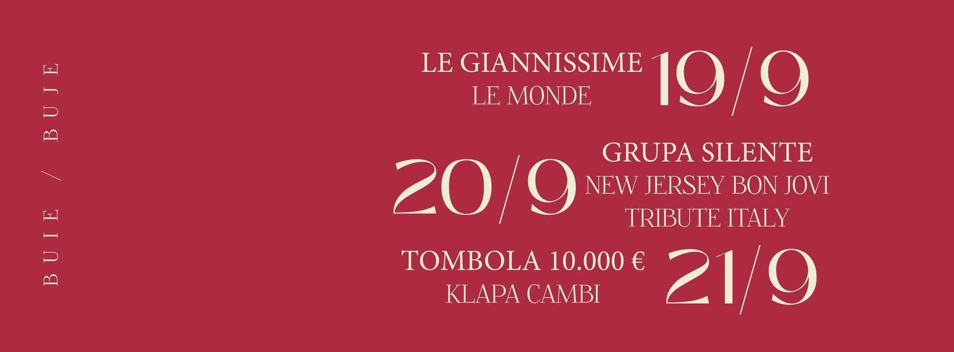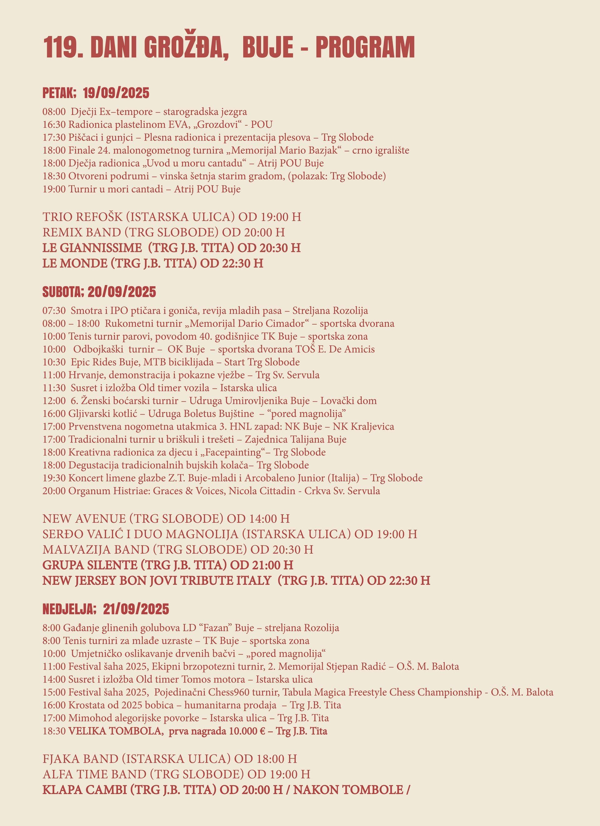 V nedeljo, 21. septembra, se vzdušje zaokroži z delavnicami, razstavami in zaključnim koncertom Klape Cambi, medtem ko se vsi z veseljem zberejo na veliki tomboli z nagradnim skladom 13.800 €, vključno z glavno nagrado v višini 10.000 €.
